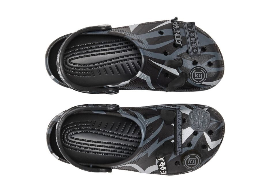 The CLOT x Crocs Classic Clog ‘Black’ sports CLOT’s Alienegra camo print, using black and grey hues with reflective brush-strokes. A pivoting heel strap gets the CLOT logo on the rivet, while vent ports enhance breathability to keep your feet dry. These clog can be customized with Jibbitz charms that include alien heads, pointy alien ears and UFOs.