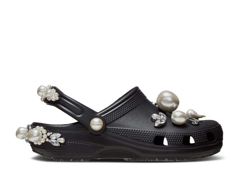The Simone Rocha x Crocs Classic Clog ‘Black’ are made from lightweight black foam, using faux pearl and gem details on the pivoting heel strap and the back of the heel. The Simone Rocha logo stands alone on the footbed. Pearls, crystals and jeweled flowers take the form of Jibbitz charms to customize your look.