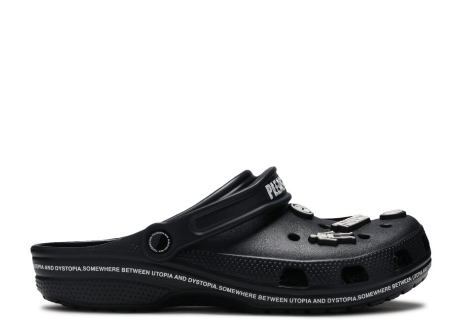 The Pleasures x Clog ‘Utopia Dystopia’ features inspiration from youth subculture, notably leather jackets and backpacks. A collaboration between Streetwear brand Pleasures and Crocs, the shoe features a black upper embellished with Jibbitz charms that draw from Pleasures’ archive. Branding appears on the slingback strap and white text around the midsole completes the look.
